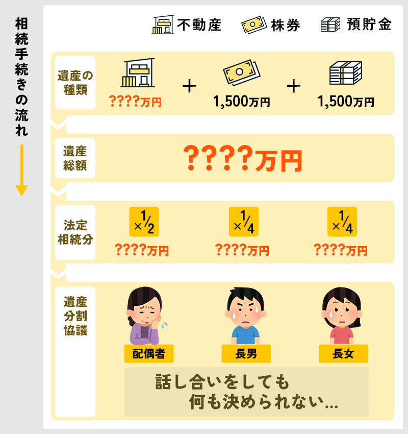 その為、いくら遺産分割協議を開こうが、それぞれが受け取る法定相続分が未確定だと、誰がどの財産をいくらもらうのかを決められないのです。